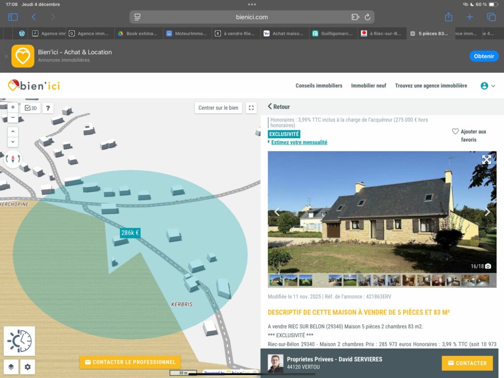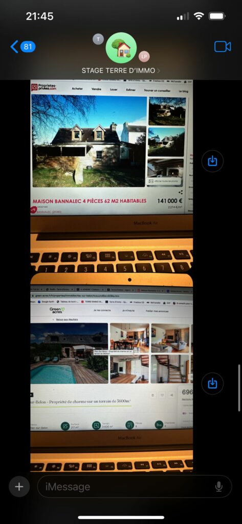 L’après-midi, nous avons rejoint leur local à Lorient à la base pour pouvoir identifier les maisons à vendre à Riec sur Belon toujours muni de l’application Coo et du site moteur Immo et nous avons réussi à trouver 13 bien à vendre avec leur adresse ect .